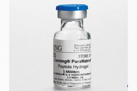 Corning? PuraMatrix? Peptide Hydrogel is a synthetic matrix used to create defined three dimensional (3D) micro-environments for a variety of cell culture experiments. To achieve optimal cell growth and differentiation, it is necessary to determine the appropriate mixture of this material and bioactive molecules (e.g., growth factors, extracellular matrix (ECM) proteins, and/or other molecules). Corning PuraMatrix Peptide Hydrogel consists of standard amino acids (1% w/v) and 99% water. Under physiological conditions, the peptide component self-assembles into a 3D hydrogel with a nanometer-scale fibrous structure. The hydrogel is readily formed in a Falcon culture dish, plate, or cell culture insert.